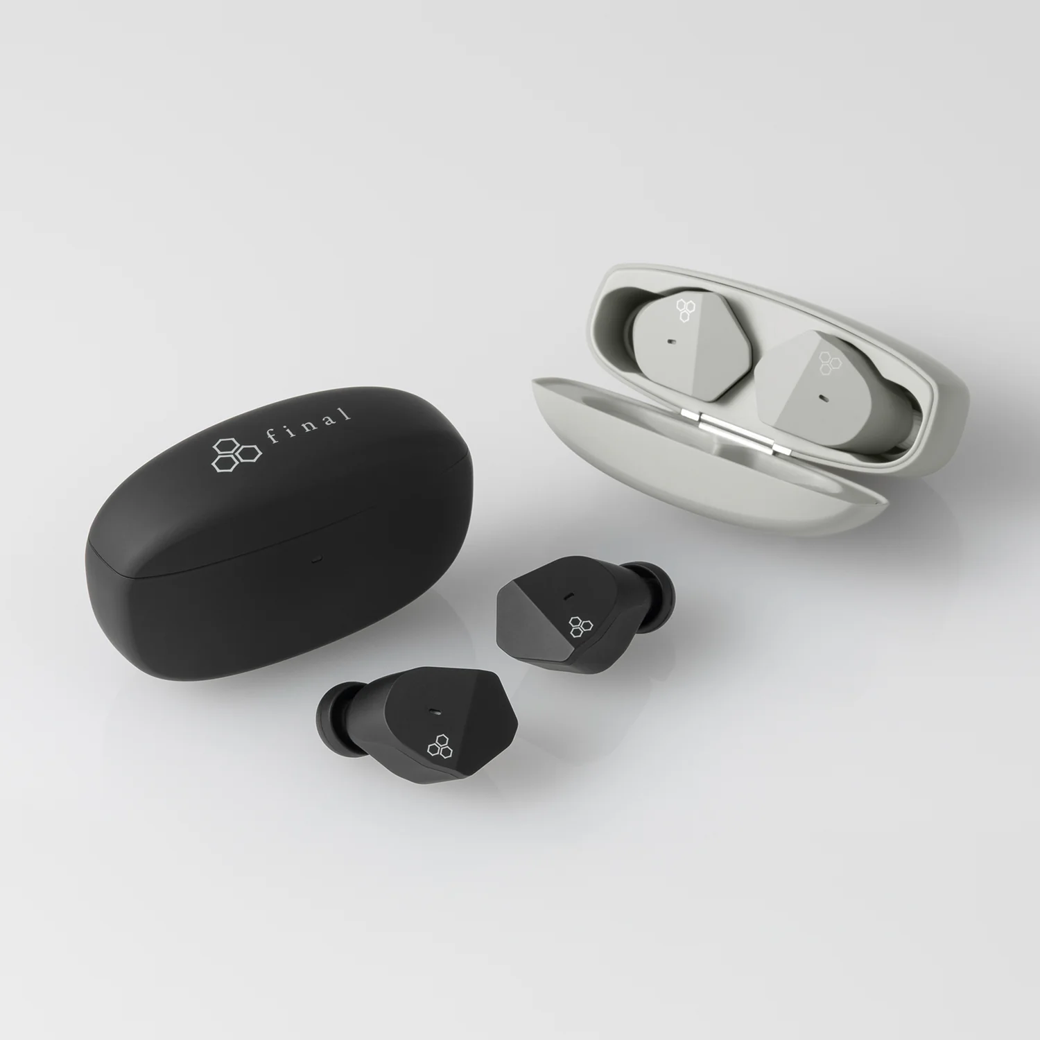 MATTE BLACKとASH GRAYの2色のカラーバリエーション。イヤホン本体と充電ケースは軽量の樹脂筐体を採用し、さらに指紋が付きにくく滑りにくいマット塗装を施しました。